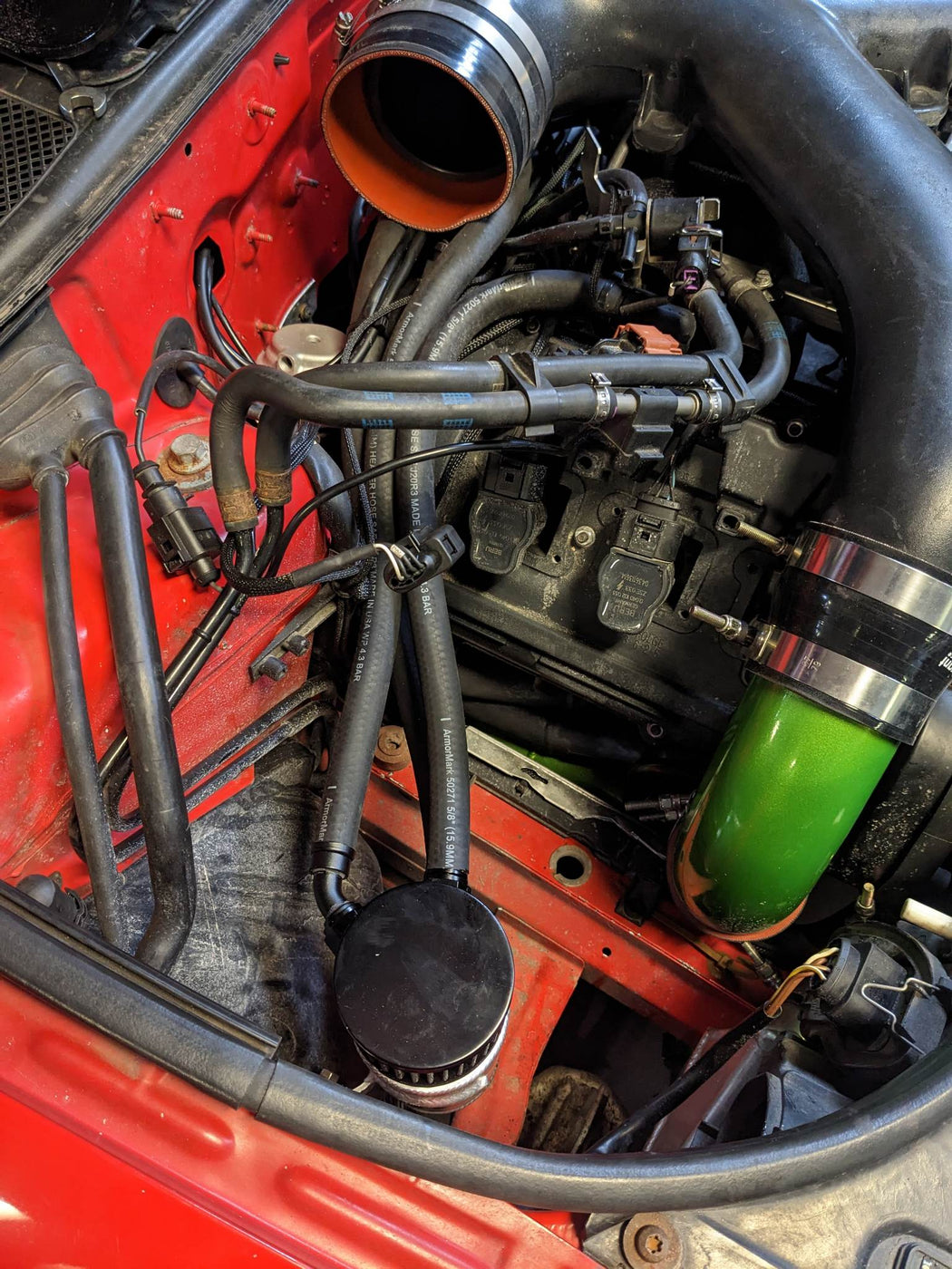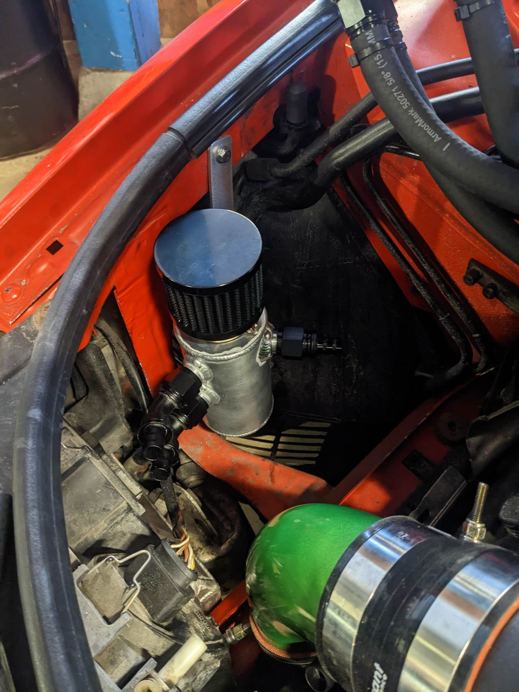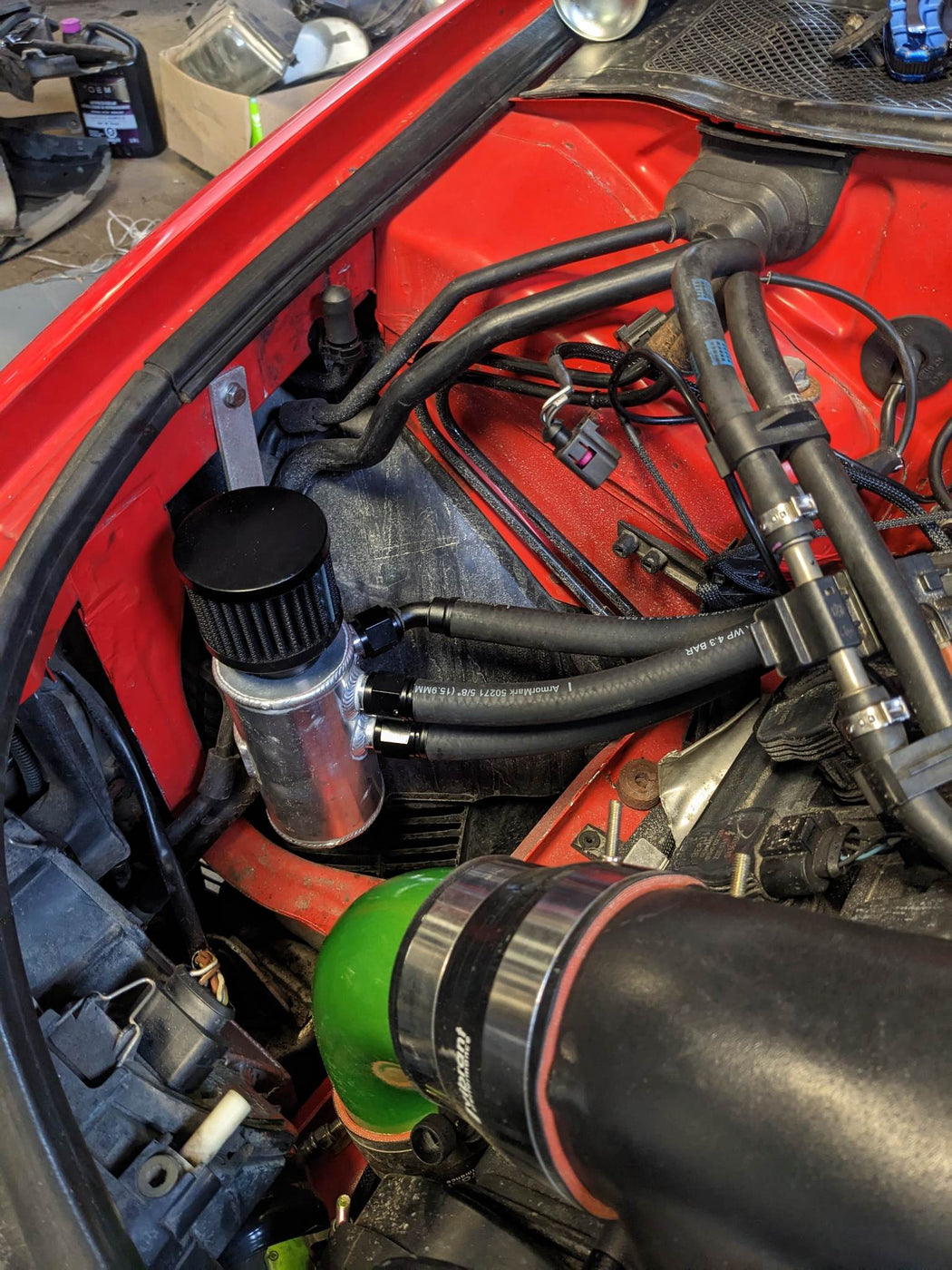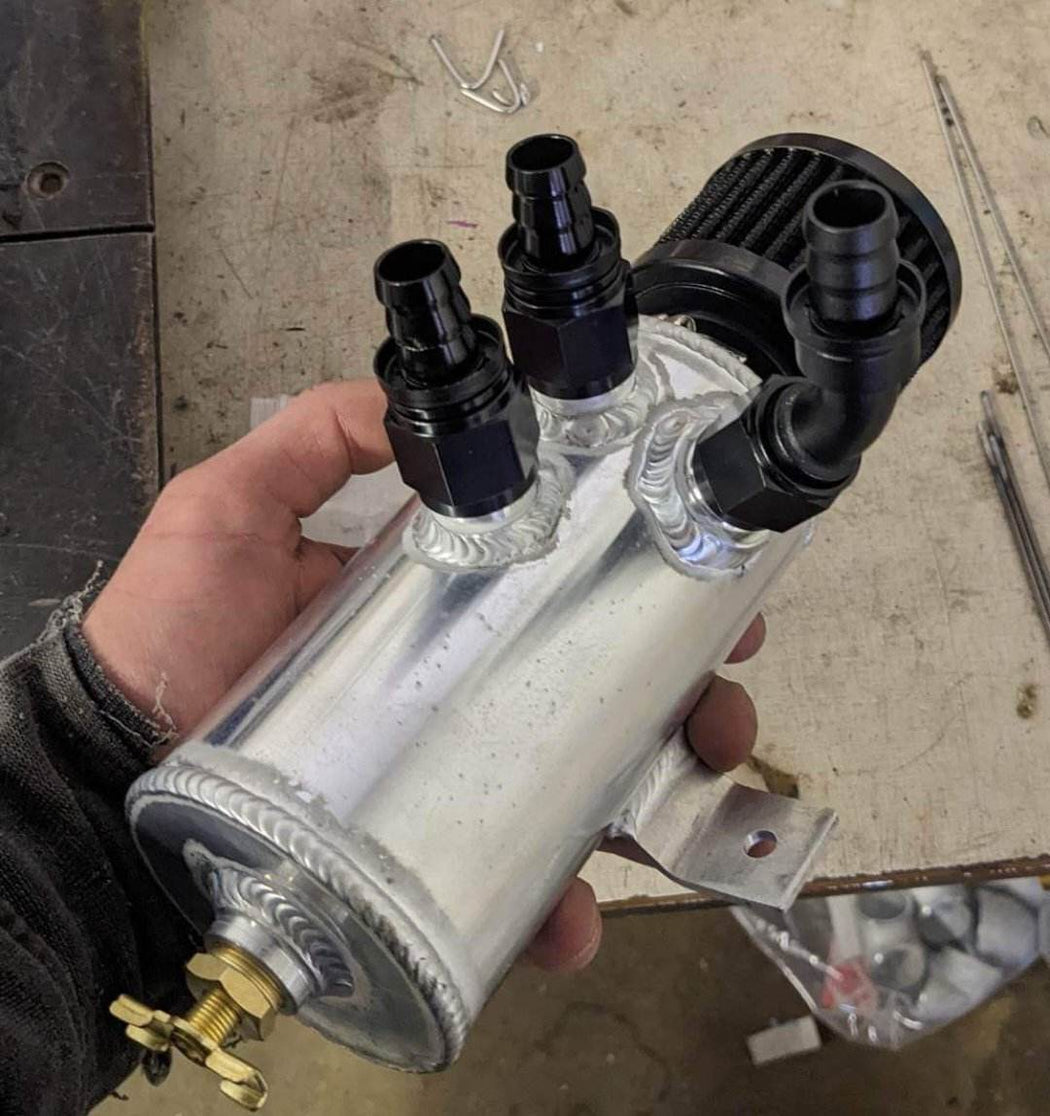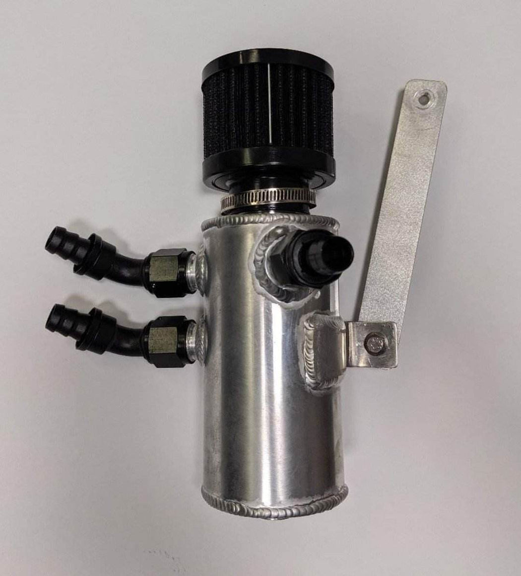 Introducing our modified budget eBay style catch can setup specific to B5 2.7t fitment.  No more giant fittings and an mess of lines snaking around the can towards the breather ports.
